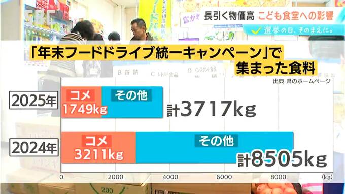 昨年末に実施したフードドライブで集まった食料品は3700キロ余り。このうち価格が上がっているコメは1700キロほどで、いずれも前の年から半減しました。