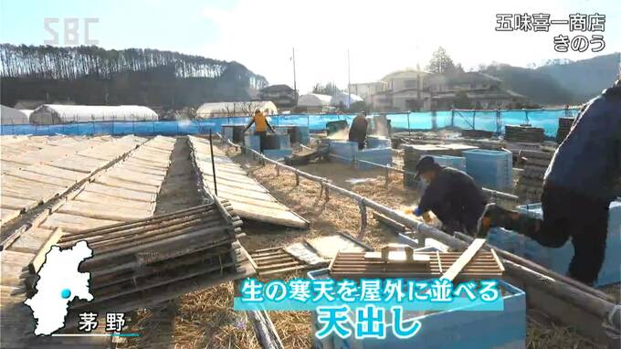 茅野市宮川の五味喜一商店では、生の寒天を屋外に並べる「天出し」作業に追われています。