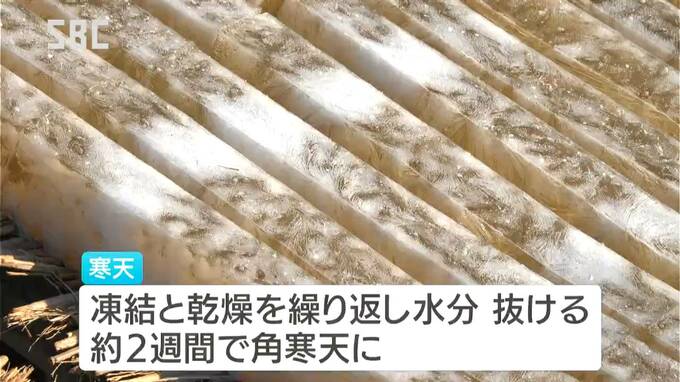 厳しい寒さにさらされて凍った寒天は、晴れた日中に乾燥。これを繰り返すことで水分が抜け「角寒天」が出来上がります。