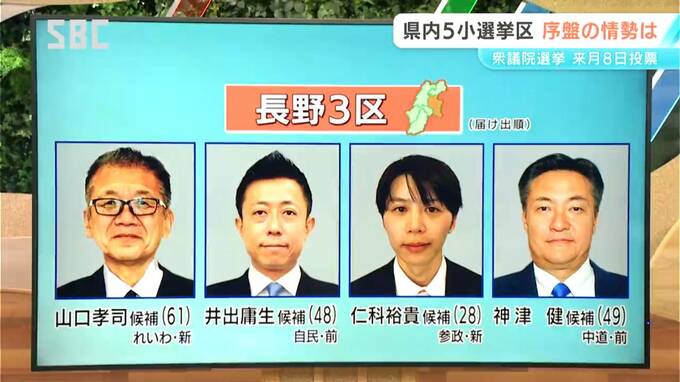3区は届け出順に、れいわ新選組・新人の山口孝司さん、自民党・前職の井出庸生さん、参政党・新人の仁科裕貴さん、中道改革連合・前職の神津健さんの4人の戦いです。
