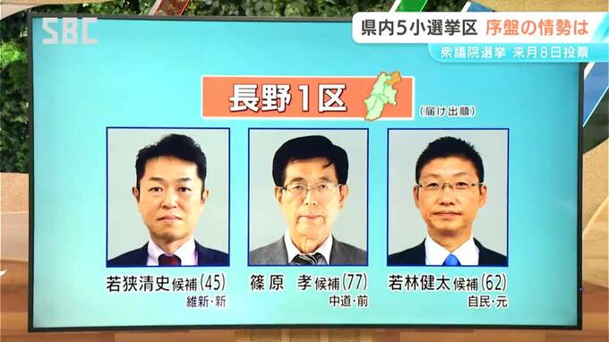 1区は届け出順に、日本維新の会・新人の若狭清史さん、中道改革連合・前職の篠原孝さん、自民党・元職の若林健太さんの3人の戦いです。