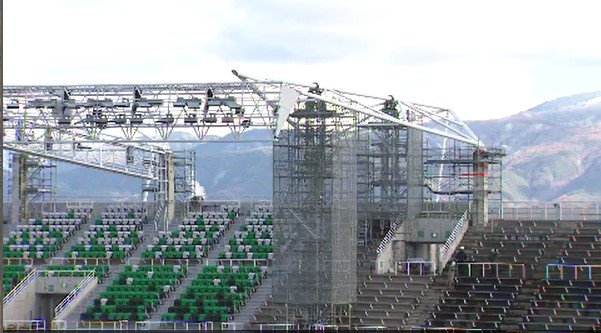 松本市のサンプロアルウィンは2025年10月、バックスタンド側の照明設備を支える鉄骨部材の一部が観客席に落下しているのが見つかり、工事などのため使えなくなっていました。