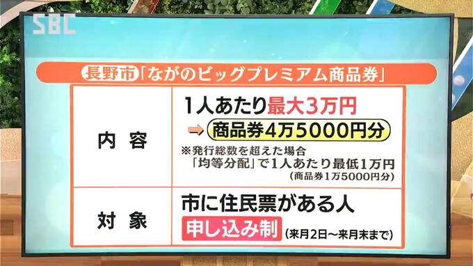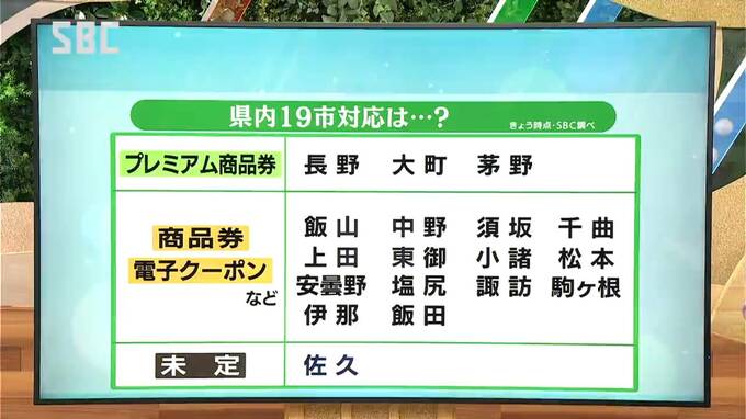 「プレミアム付き商品券」を配布する予定なのは、長野市のほかに大町市と茅野市。また、中野や小諸など多くの市で、商品券の対応を予定しているということです。これらの商品券は、各市によって金額が異なり、各世帯への発送や、引換券の配布を予定しているということです。