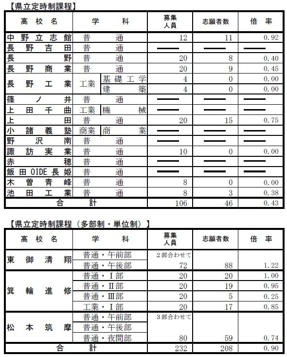 前期選抜の志願者数【長野県公立高校入試2026】前期選抜には5469人が出願【全校一覧掲載】全日制課程は1.22倍 定時制課程は0.43倍 多部制・単位制0.43倍 2026年2月4日(水) 16:57 国内 【県立定時制課程、多部制・単位制】 前期選抜は9日(火)(一部は10日も実施)に行われ、合格発表は18日(水)です。