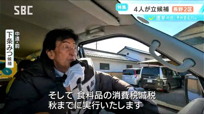 下条候補:「党の名前はどんどん変わっていますけど、僕自身は手取りのアップを一番最初から言ってますし、減税して、本当に苦労してる方々に少しお返ししたいというのは変わっていませんのでね。それを辛抱強く訴えていきながら、僕は裏切りません、まっすぐ行きますよ、ってことを伝えていければなと」