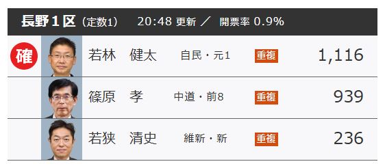 自民若林氏と中道篠原氏の差は200票【衆議院選挙長野1区開票速報】午後8時48分現在 開票率0.9% 2026年2月8日(日) 21:18 国内 ~衆議院選挙信毎SBC開票速報~ 信毎とSBCが独自に集計した長野1区の最新の各候補の得票です。 開票率は0.9%です。