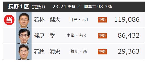 中道篠原氏の最新の惜敗率は72.6% 自民若林氏との差は3万2000票【衆議院選挙長野1区開票速報】午後11時24分現在 開票率98.3% 2026年2月8日(日) 23:51 国内 ~衆議院選挙信毎SBC開票速報~ 信毎とSBCが独自に集計した長野1区の最新の各候補の得票です。 開票率は98.3%です。 この時点での、中道篠原さんの惜敗率は、72.6%です。