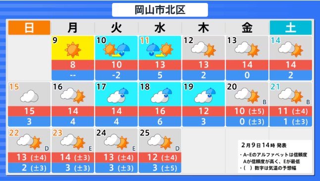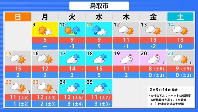 中国地方の向こう2週間の気温は、寒気の影響を受けにくいため高い日が多く、15日頃からはかなり高くなる可能性があります。農作物の管理等に注意してください。積雪の多い地域ではなだれに注意してください。