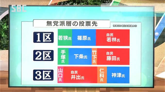 信濃毎日新聞とSBCが共同で実施した出口調査によりますと、支持政党を持たないいわゆる「無党派層」の投票行動は、1区は無党派層の46パーセントが若林さんに。2区は藤田さんに47パーセント、3区も井出さんに49パーセントとおよそ半数が自民の候補に投票しました。