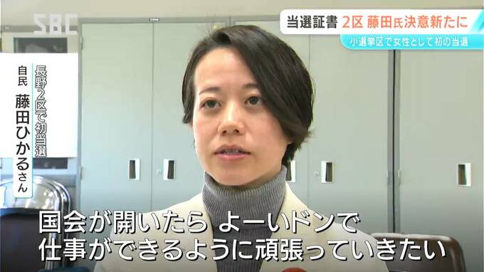 衆議院長野2区で、県内の小選挙区としては女性で初めて当選した、自民党の藤田ひかるさんが当選証書を受けとり、「いろいろな人が政治に参加できる環境づくりも進めたい」と意気込みを語りました。