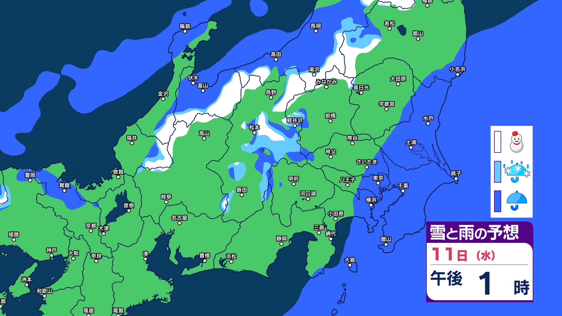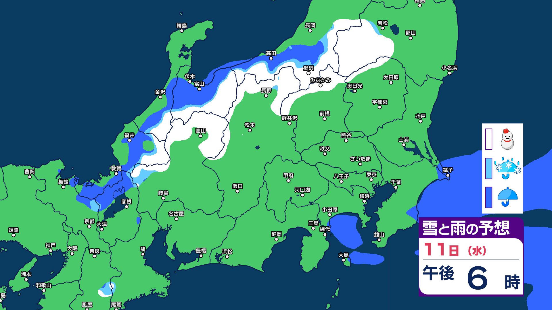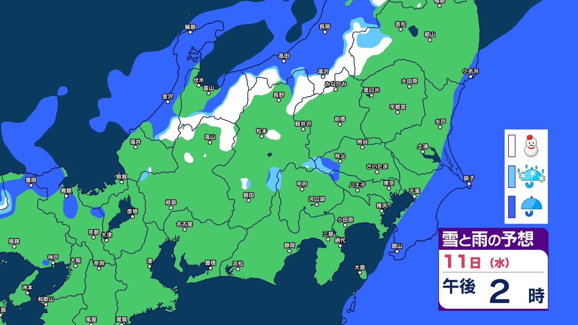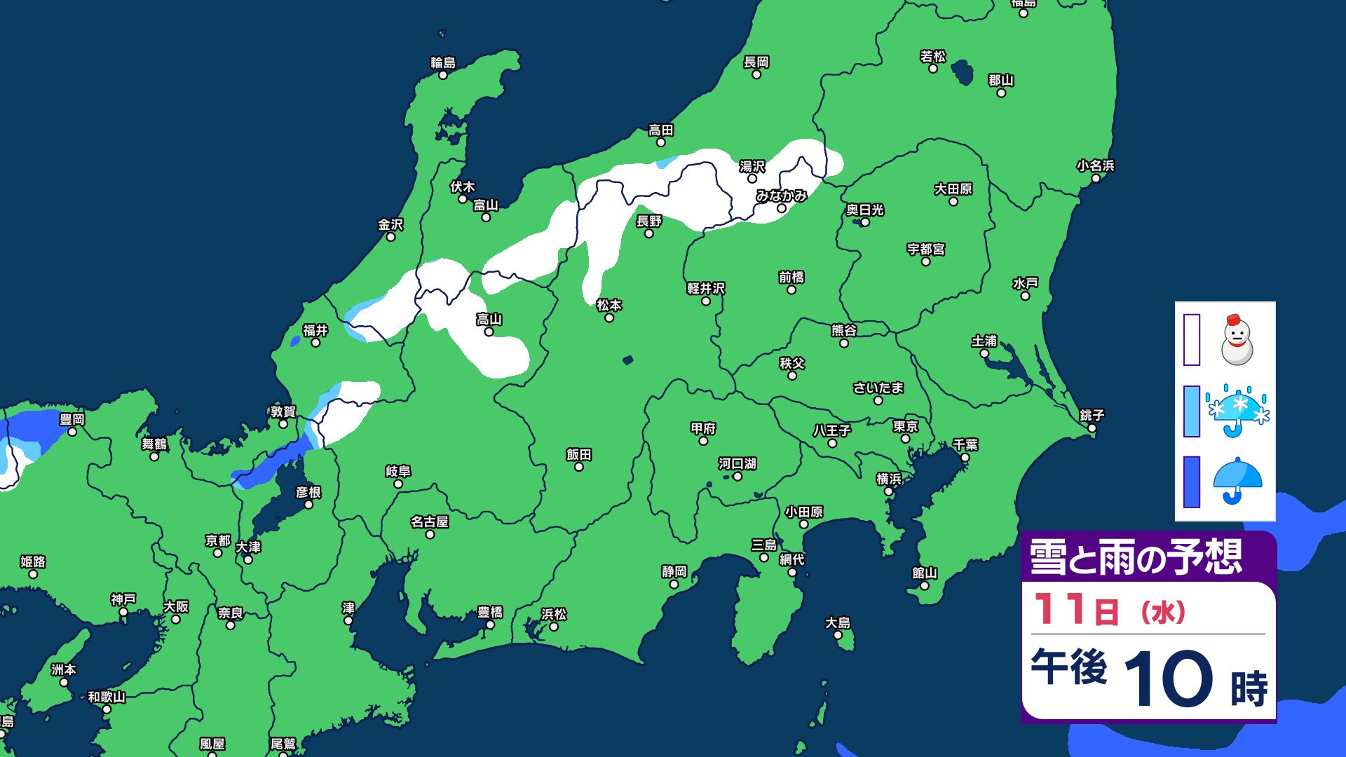 【関東甲信 1時間ごとの雪と雨のシミュレーション】あす11日(祝日)は神奈川・千葉で警報級の大雨の可能性 関東甲信は前線伴った低気圧の通過…広範囲で雨か雪に 長野は雪に注意 2026年2月10日(火) 21:29 国内