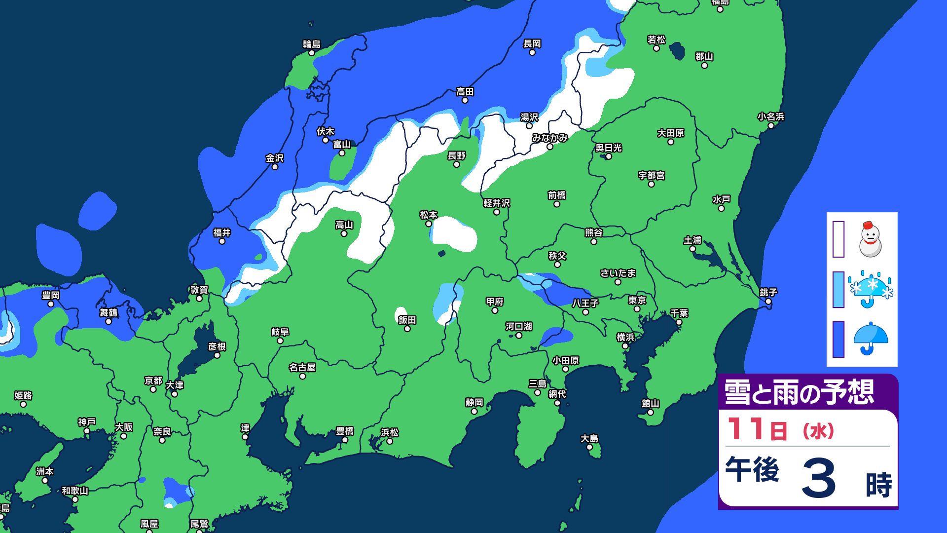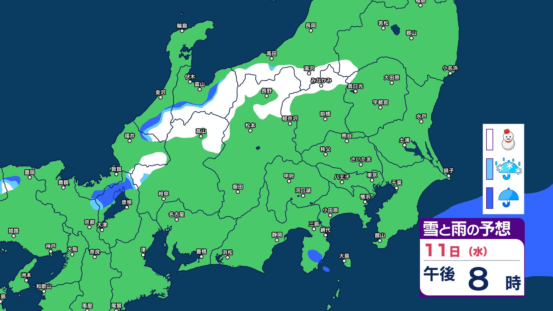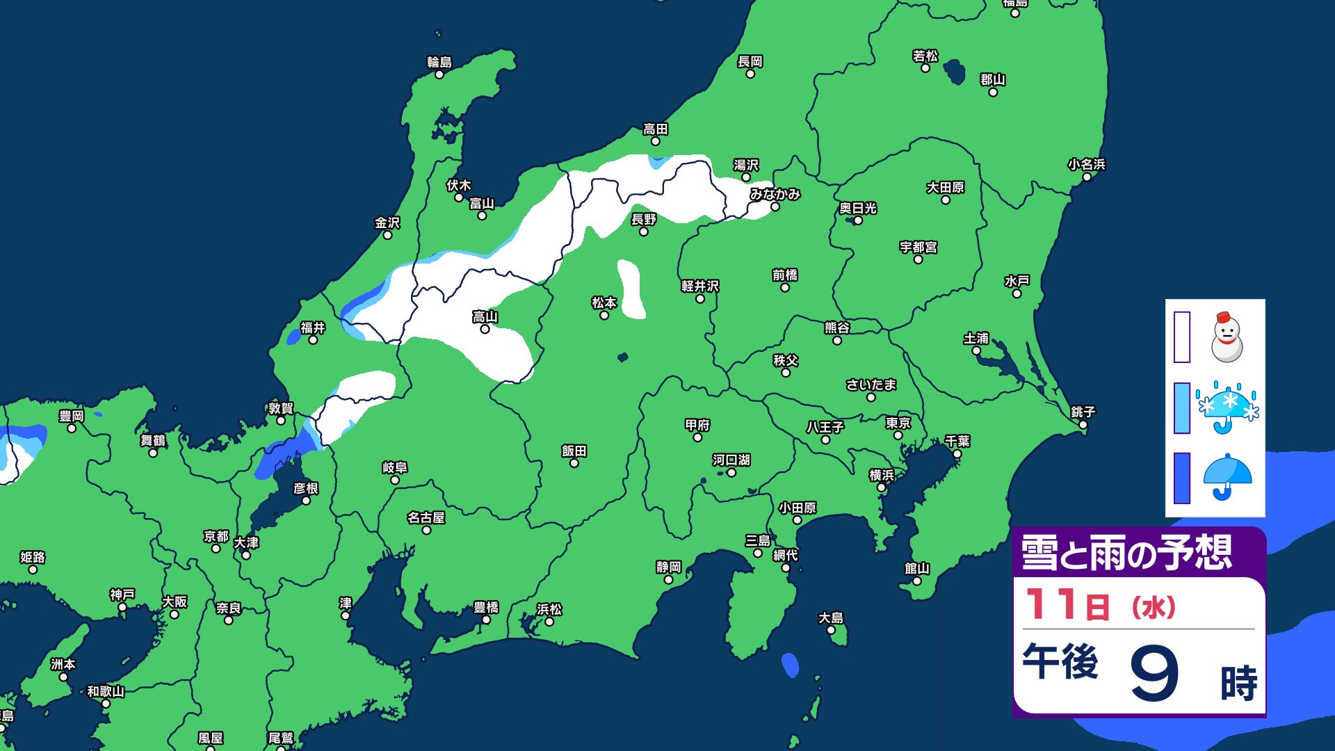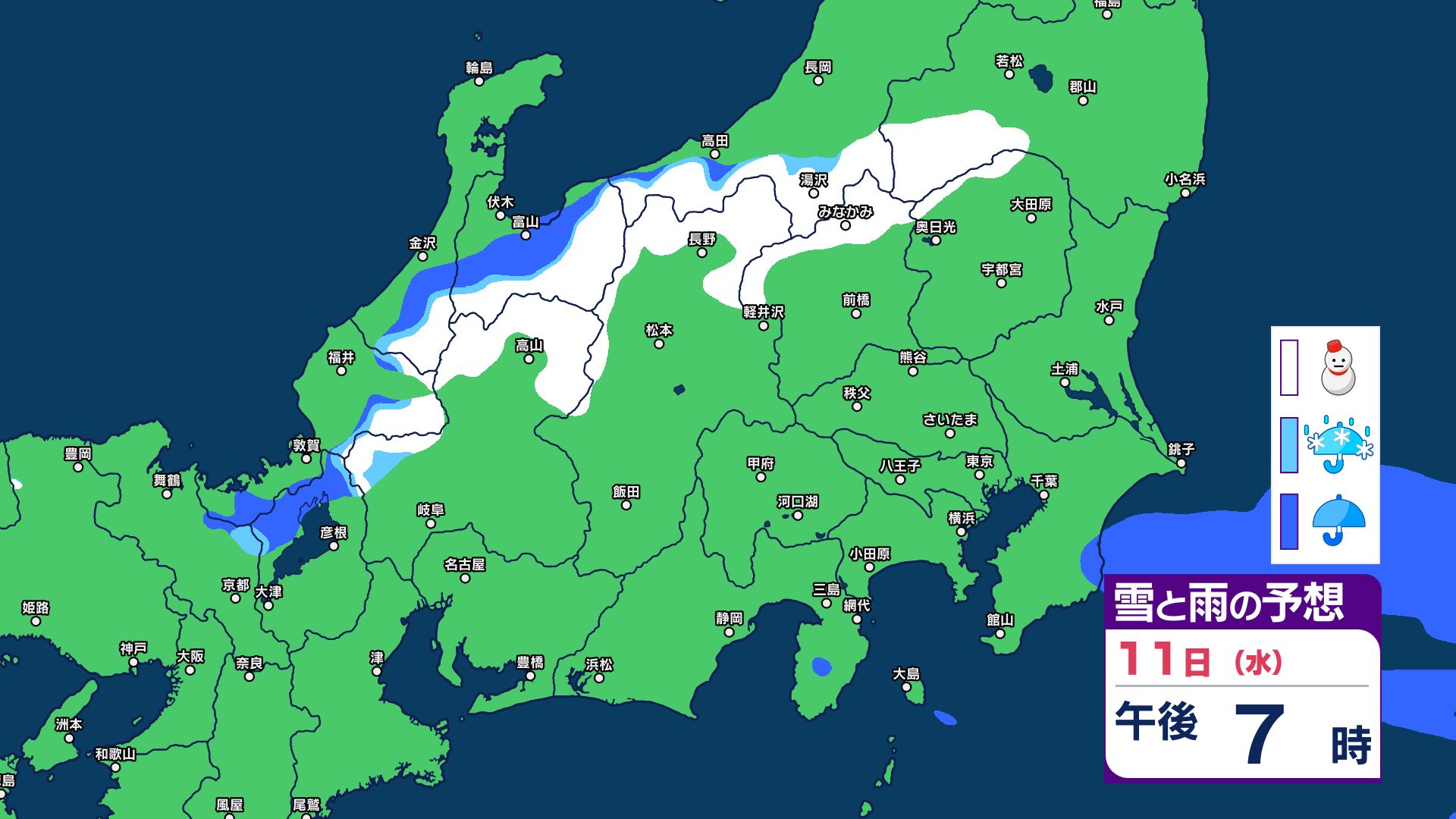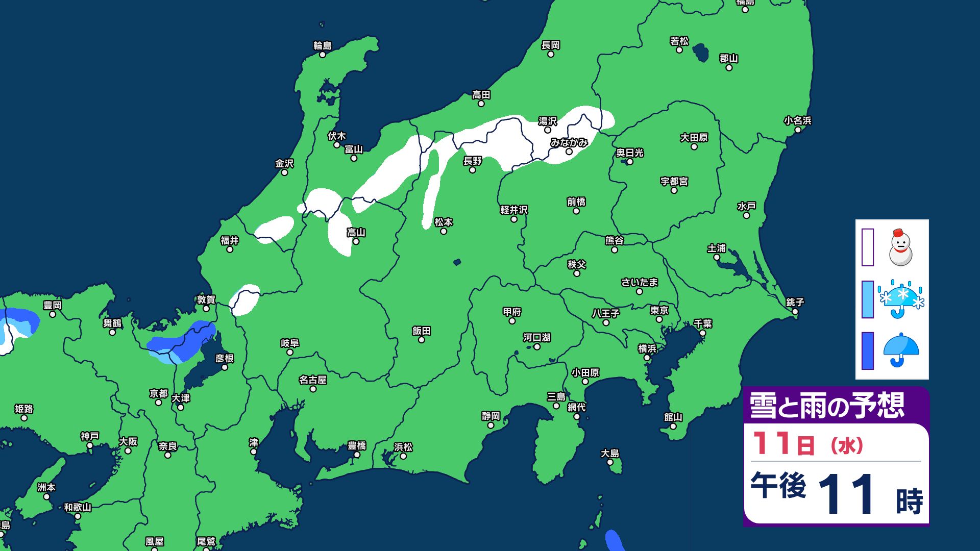 【関東甲信 1時間ごとの雪と雨のシミュレーション】あす11日(祝日)は神奈川・千葉で警報級の大雨の可能性 関東甲信は前線伴った低気圧の通過…広範囲で雨か雪に 長野は雪に注意 2026年2月10日(火) 21:29 国内