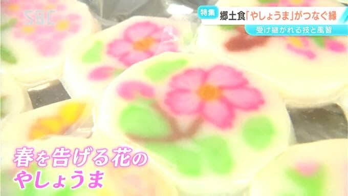 それは梅や福寿草など、春を告げる花々を表現したやしょうま。作っているのは筑北村の坂井地区にある郷土食研究会、40代から90代の11人です。