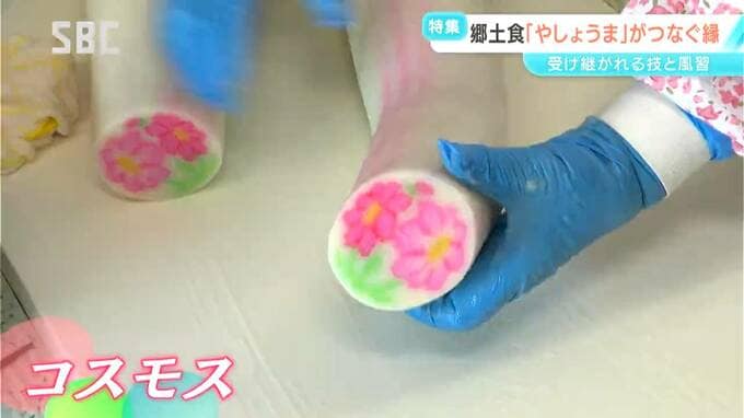 やしょうまに使うのは、米の粉と熱湯。蒸かした生地に食紅をつけて作ります。数十種類の細かいパーツを組み合わせ、巻きずしを作るようにまとめ上げます。
