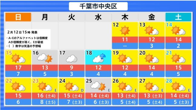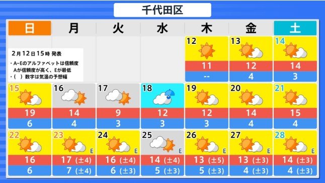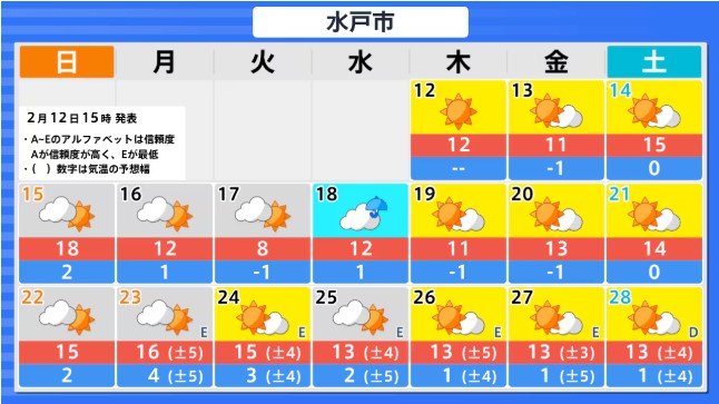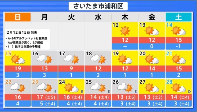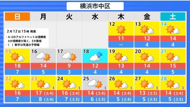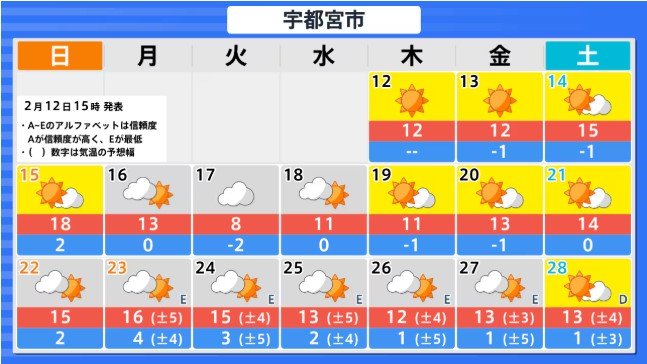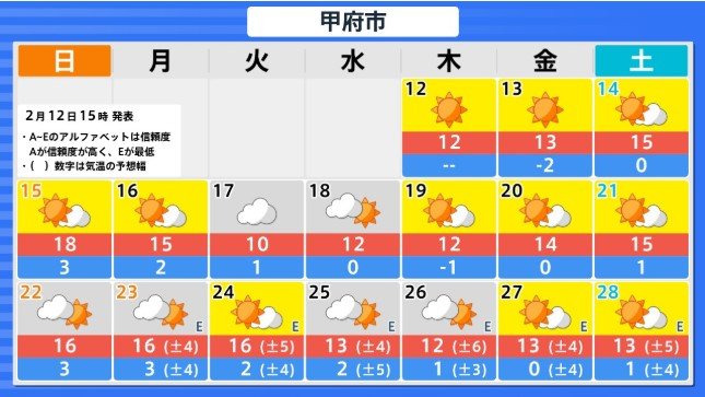 関東甲信地方の向こう2週間の気温は、寒気の影響を受けにくく暖かい空気が流れ込みやすい時期があるため高い日が多く、20日頃からはかなり高くなる見込みです。農作物の管理等に注意してください。積雪の多い地域ではなだれに注意してください。