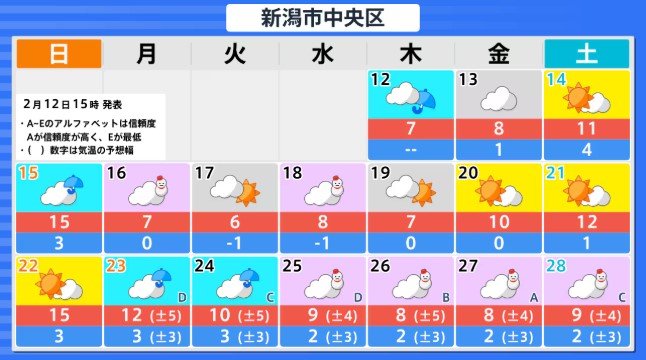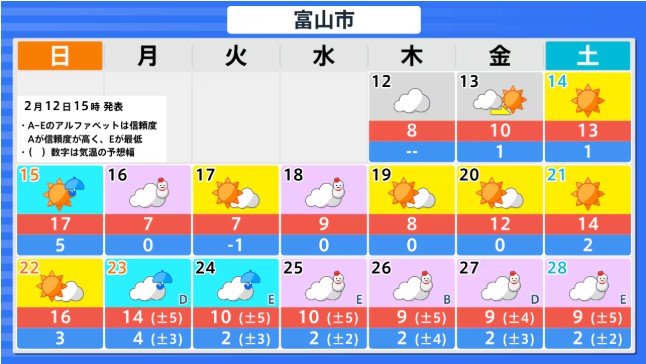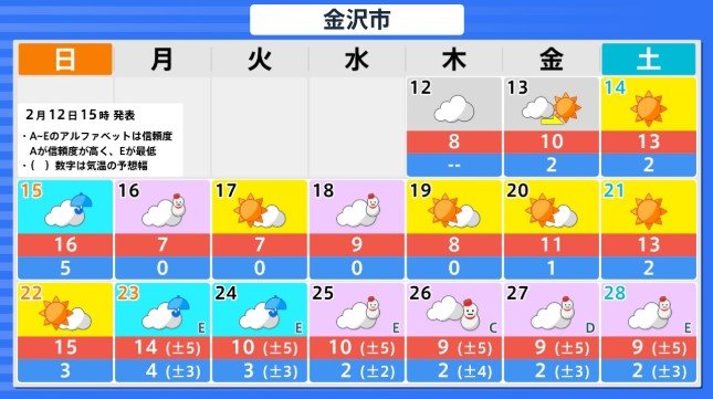 北陸地方の向こう2週間の気温は、寒気の影響を受けにくいため高い日が多く、20日頃からはかなり高くなる可能性があります。農作物の管理等に注意してください。積雪の多い地域ではなだれに注意してください。