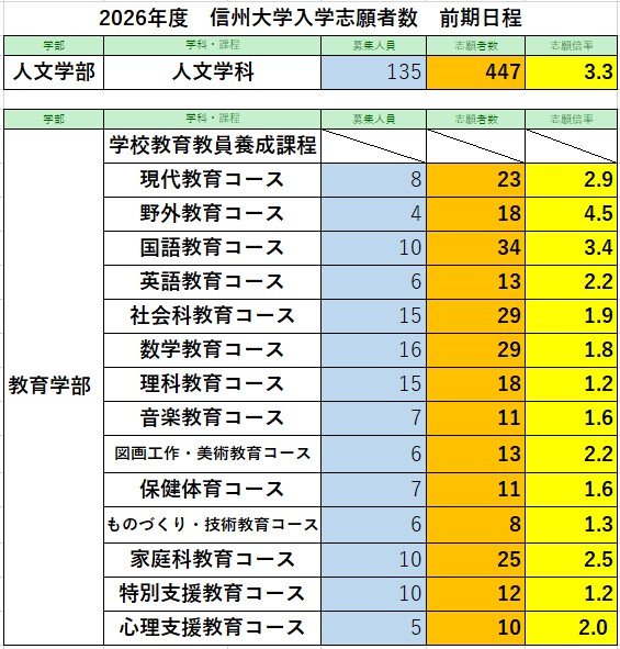 信州大学・入学志願者数【前期日程】3311人が志願 志願倍率は2.9倍 【後期日程】2622人が志願 志願倍率は7.1倍 【各学部志願倍率一覧掲載】