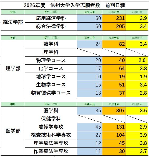 信州大学・入学志願者数【前期日程】3311人が志願 志願倍率は2.9倍 【後期日程】2622人が志願 志願倍率は7.1倍 【各学部志願倍率一覧掲載】