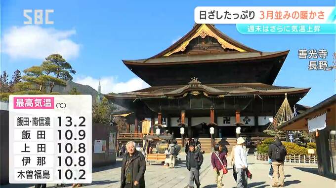 きょうの最高気温は飯田市南信濃で13.2度、また上田や伊那などでも10度を超え、各地で3月並みの暖かさとなりました。