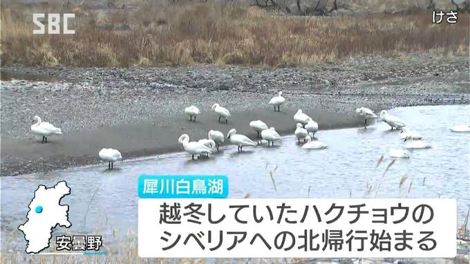 安曇野市の犀川白鳥湖では、越冬のため飛来していたハクチョウがおよそ4000キロ離れた生まれ故郷のシベリアへ戻る「北帰行」が始まっています。