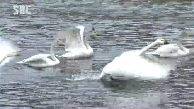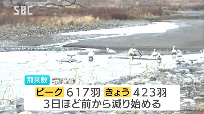 観察を続ける「アルプス白鳥の会」によりますと、2月上旬のピーク時には、市内で合わせて617羽が確認されていましたが、3日ほど前から数が減り始め、けさまでに200羽ほどが飛び立ったとみられます。