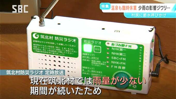 (防災ラジオの放送):「現在、筑北村では雨量が少ない期間が続いたため、水道水の水源が著しく低下しており、断水になる可能性があります。村民の皆さまにはできる限りの節水にご協力をお願いします」