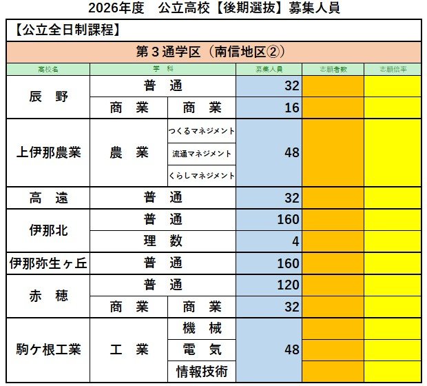 【長野県・高校入試】公立高校の後期選抜 募集人員【全校一覧掲載】3月10日(火)実施・3月19日(木)合格発表