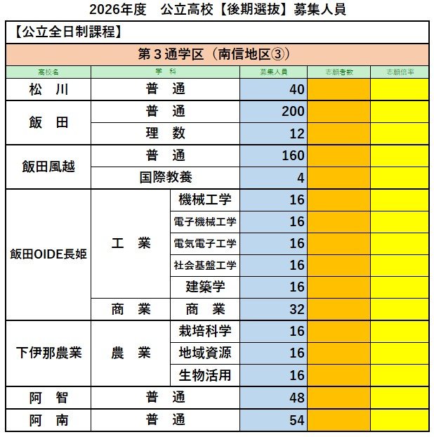 【長野県・高校入試】公立高校の後期選抜 募集人員【全校一覧掲載】3月10日(火)実施・3月19日(木)合格発表