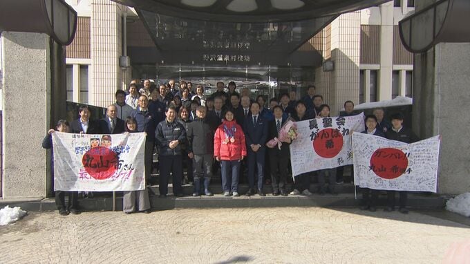 上野村長は「シーズンが終わったら、盛大にパレードをやりたい」と話し、丸山選手は「楽しみにしています」と応じていました。
