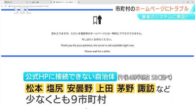 長野県内の複数の自治体で公式ホームページに接続できなくなり、行政サービスにも影響が出ています。ホームページの制作などを請け負っている業者のシステムにトラブルがあったとみられています。