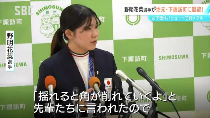 首から下げた銅メダルを大切に手で押さえながら下諏訪町役場を訪れた野明花菜選手。