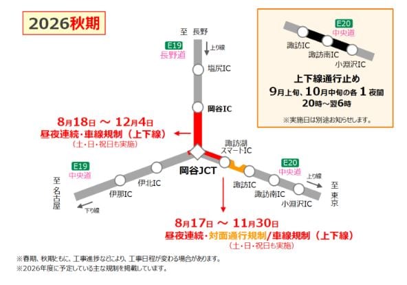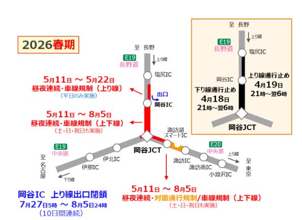 追突事故や渋滞などの原因にもなっている長野道の岡谷ジャンクション周辺のリニューアル工事が、2026年も4月18日から始まることになりました。