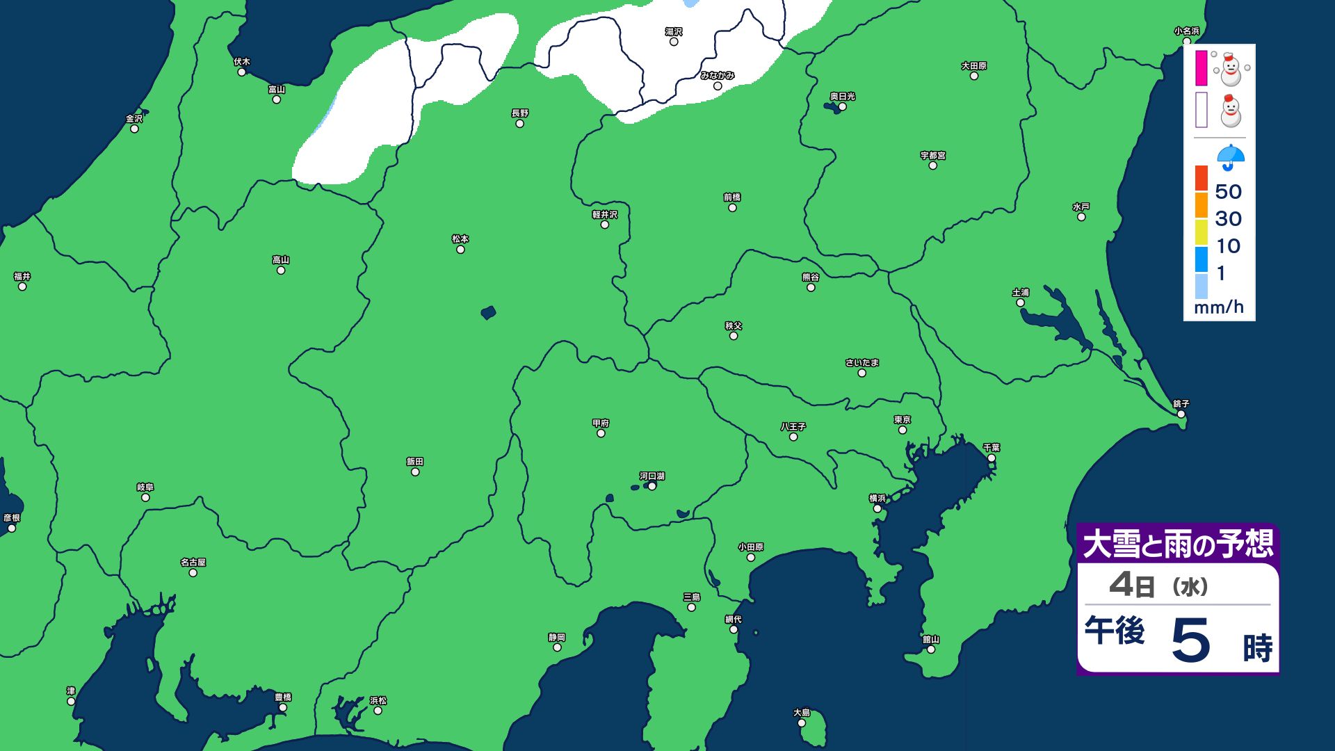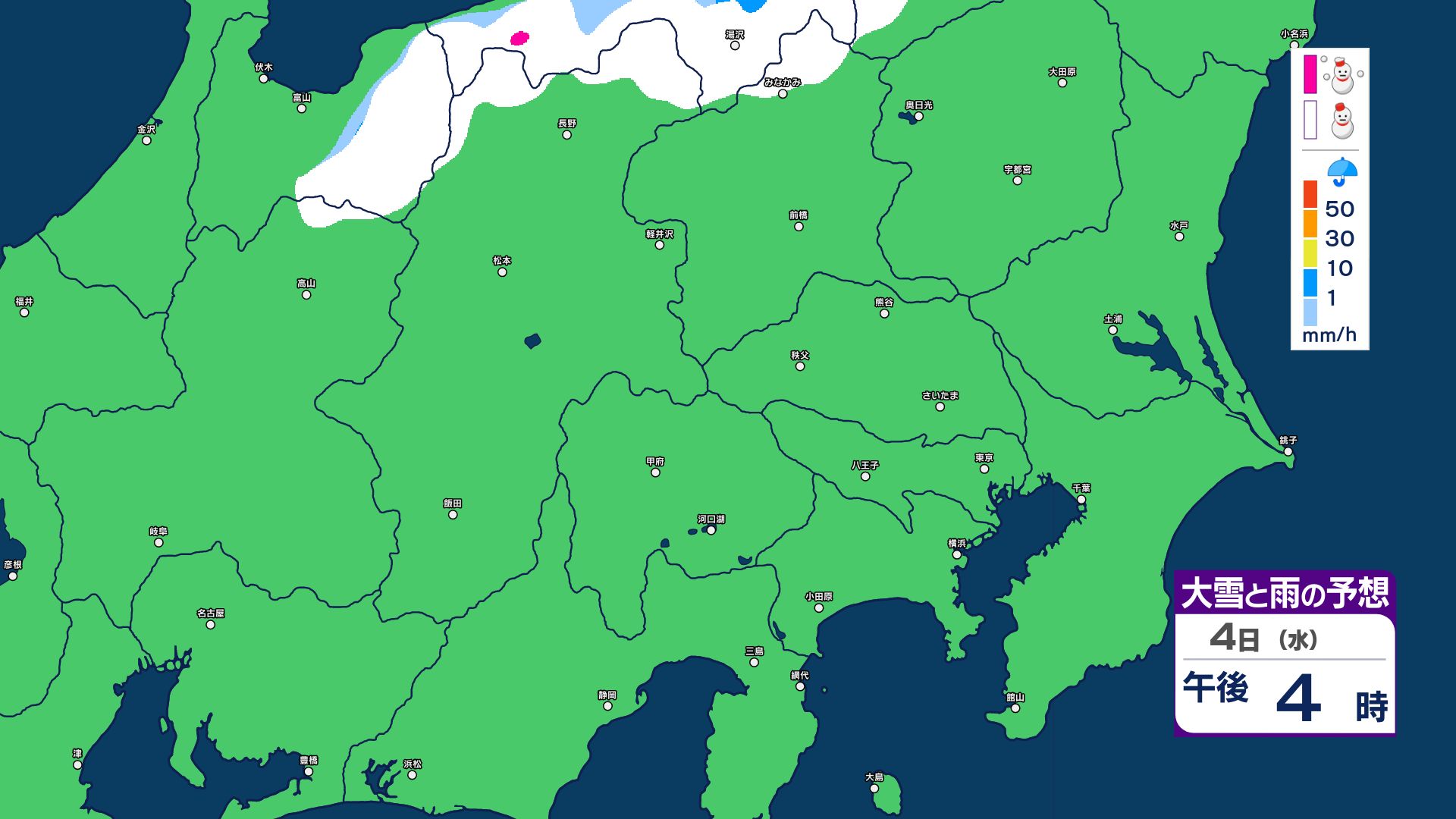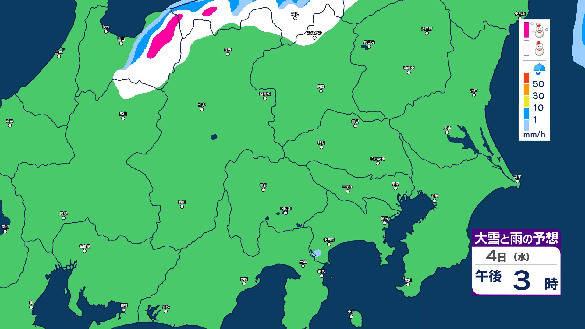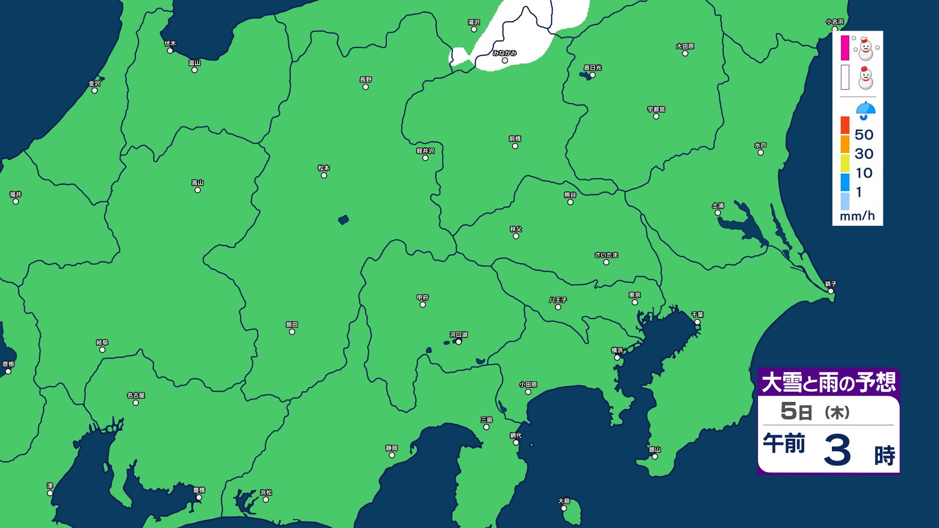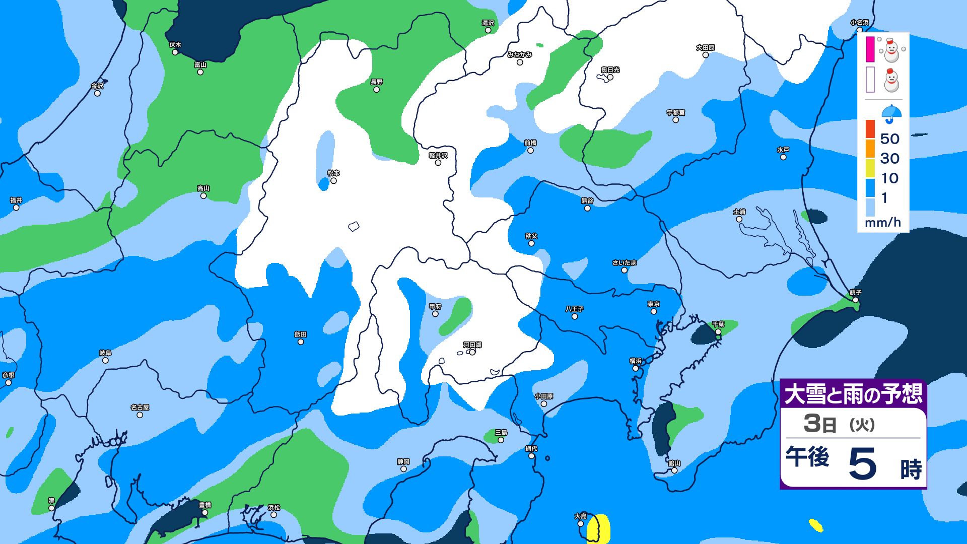 【大雪情報】長野県中部 4日明け方にかけ 大雪や路面の凍結による交通障害に十分注意【雪と雨のシミュレーション画像掲載】20センチ…大北山沿い・上田菅平・佐久・乗鞍上高地・諏訪(~4日午後6時・多い所)長野地方気象台 2026年3月3日(火) 16:31 国内 大雪と雨の予想(3日~5日)