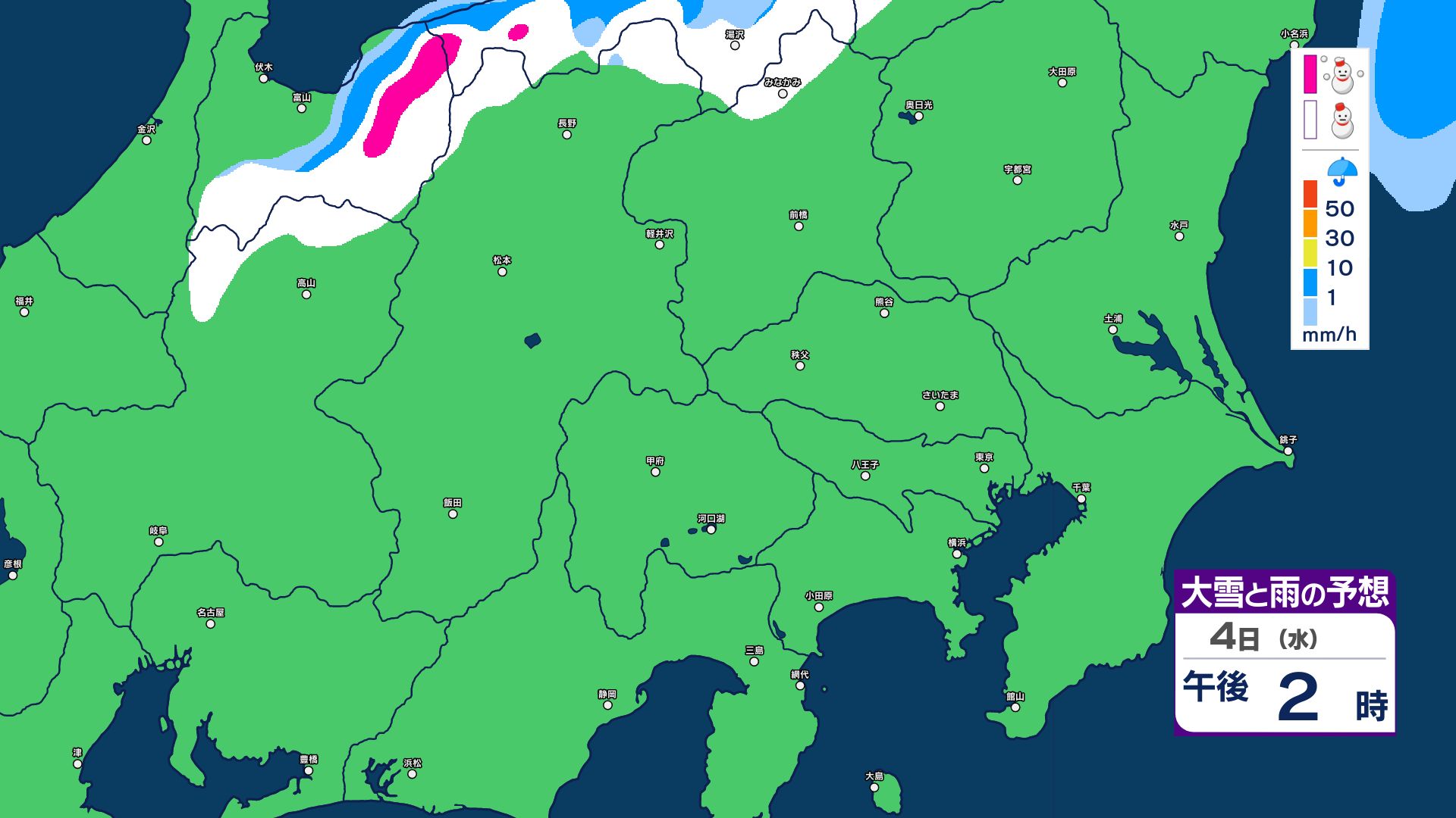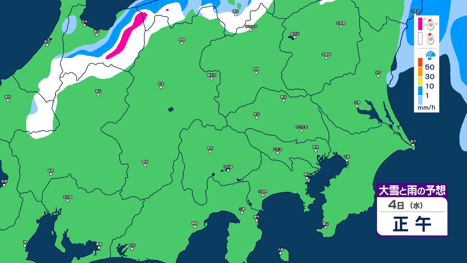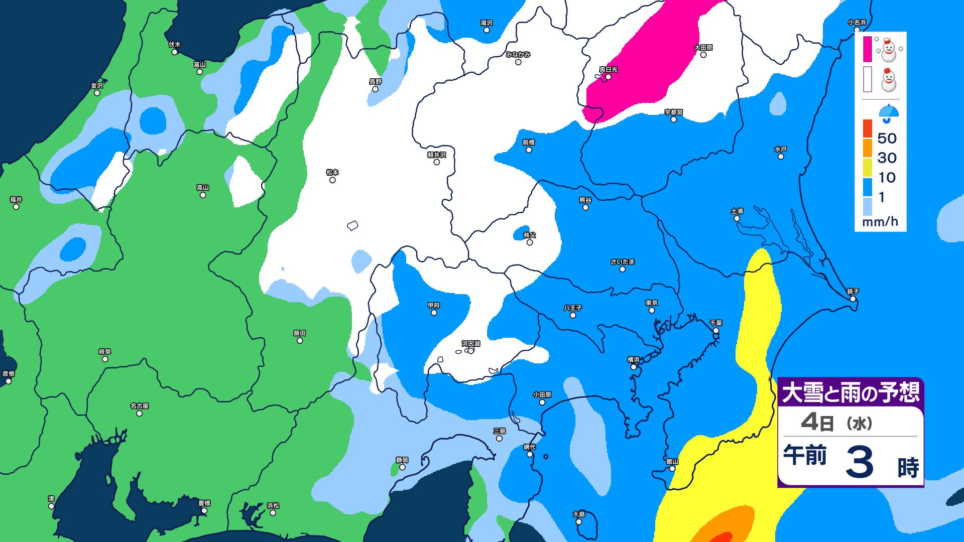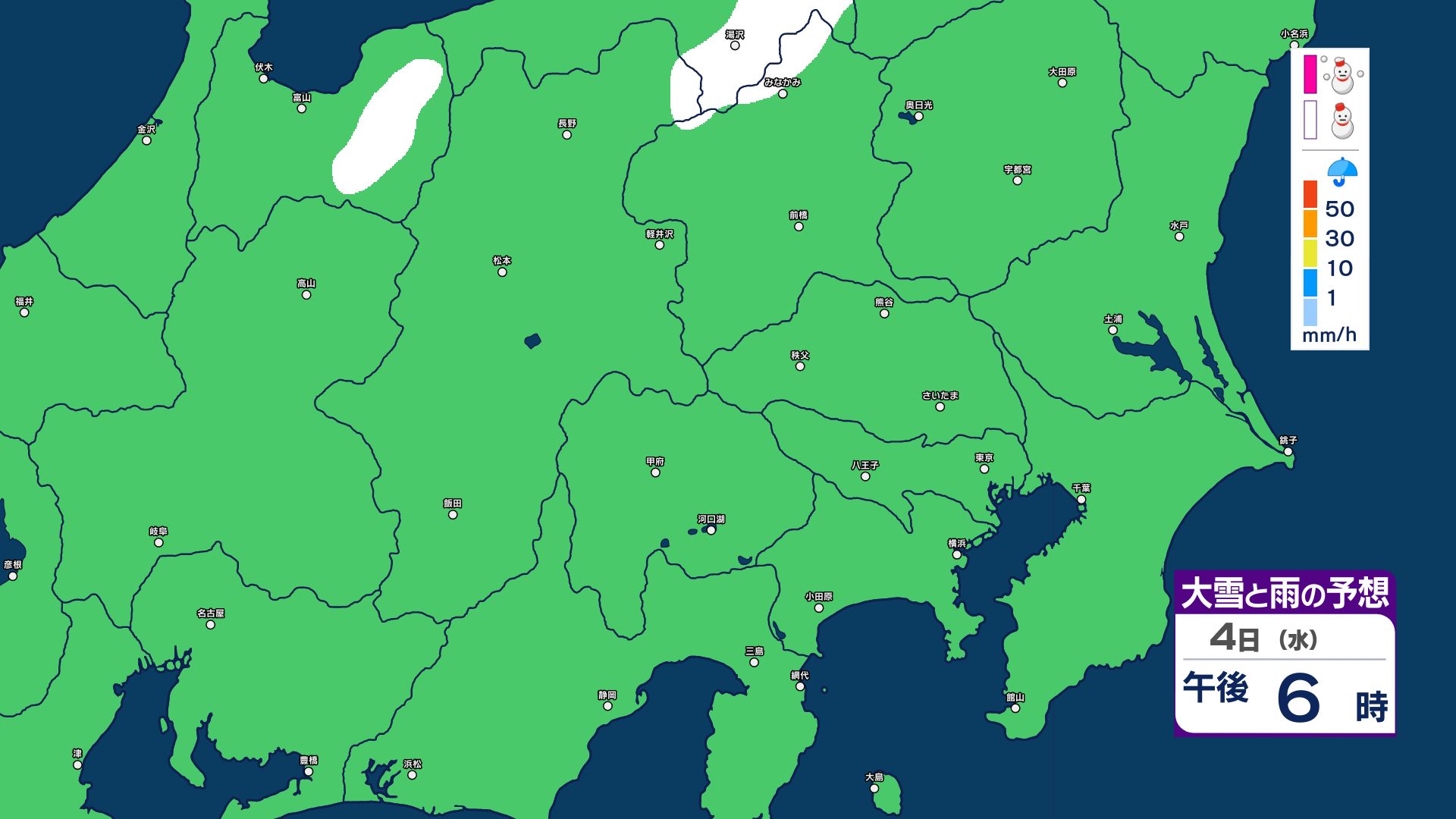 【大雪情報】長野県中部 4日明け方にかけ 大雪や路面の凍結による交通障害に十分注意【雪と雨のシミュレーション画像掲載】20センチ…大北山沿い・上田菅平・佐久・乗鞍上高地・諏訪(~4日午後6時・多い所)長野地方気象台 2026年3月3日(火) 16:31 国内 大雪と雨の予想(3日~5日)