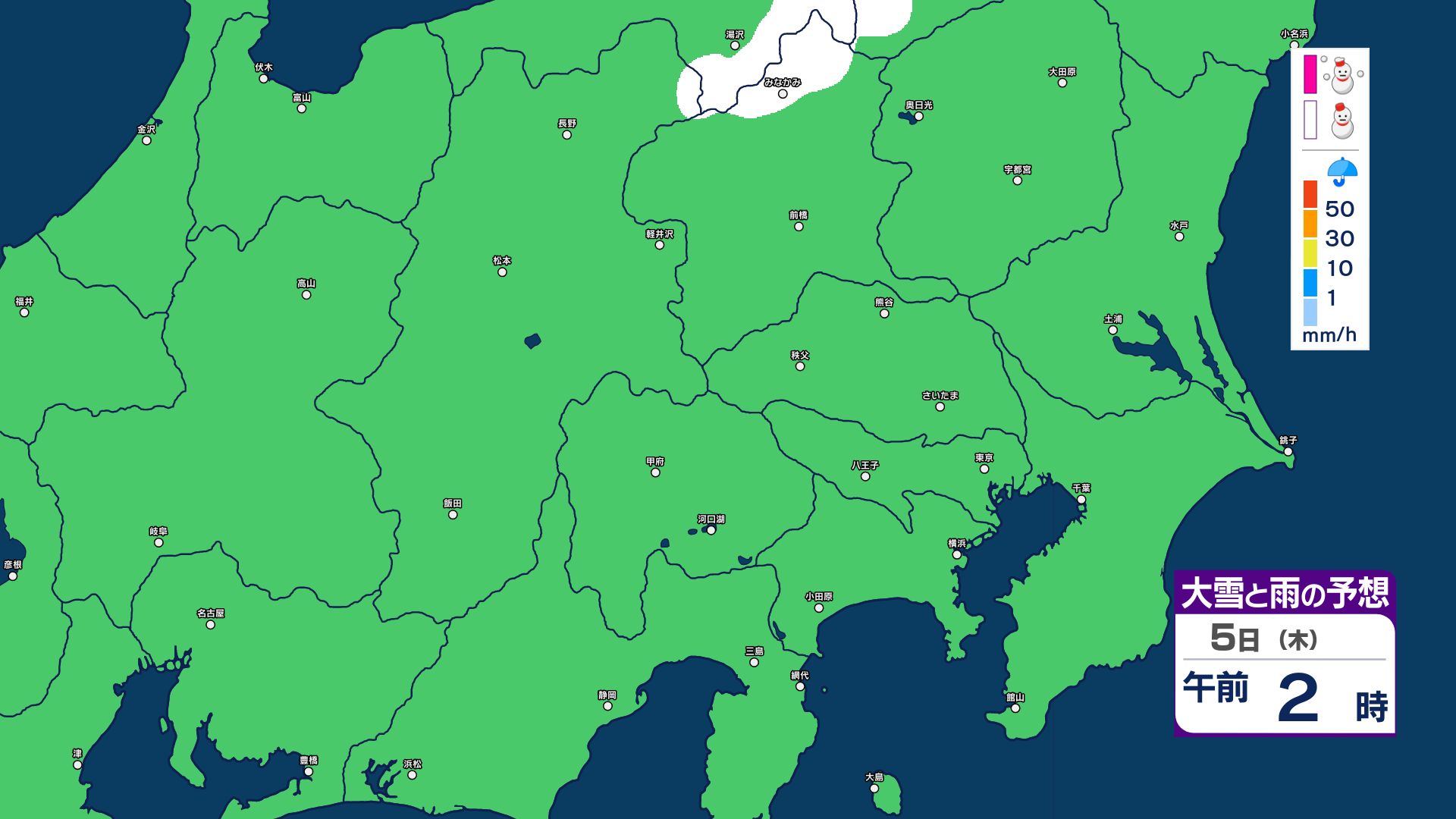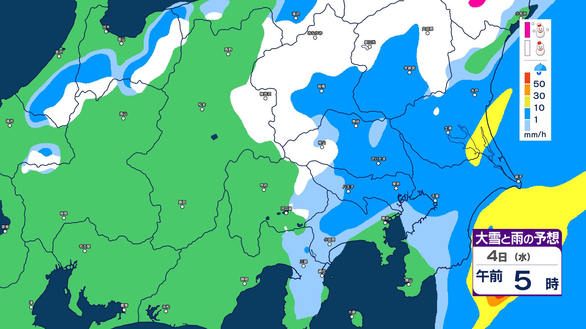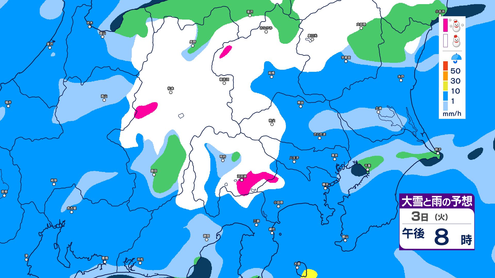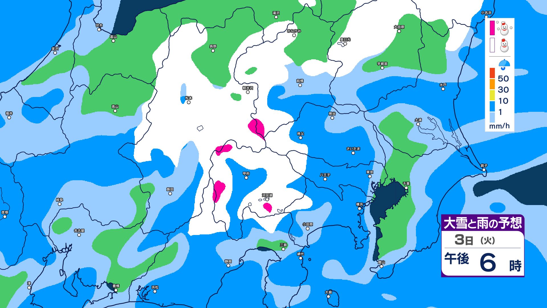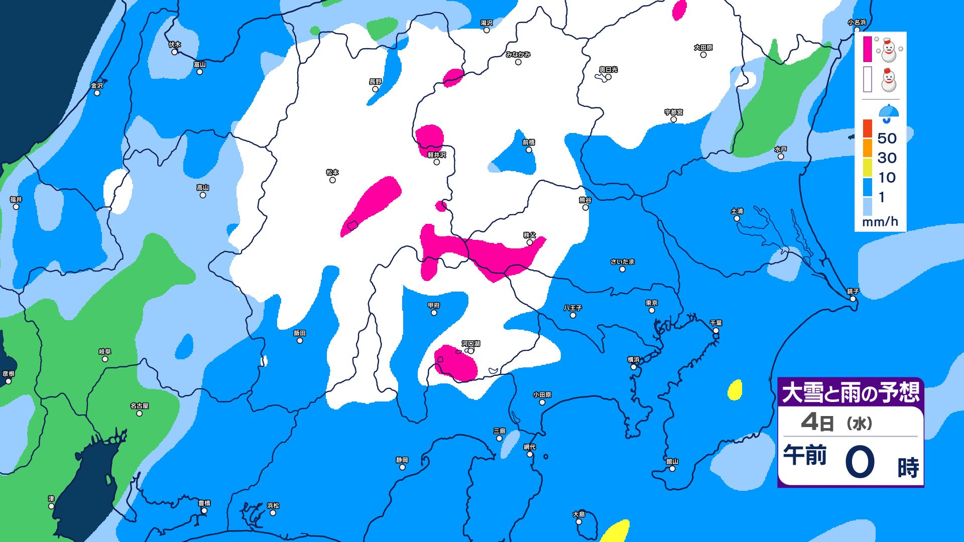 【大雪情報】長野県中部 4日明け方にかけ 大雪や路面の凍結による交通障害に十分注意【雪と雨のシミュレーション画像掲載】20センチ…大北山沿い・上田菅平・佐久・乗鞍上高地・諏訪(~4日午後6時・多い所)長野地方気象台 2026年3月3日(火) 16:31 国内 大雪と雨の予想(3日~5日)