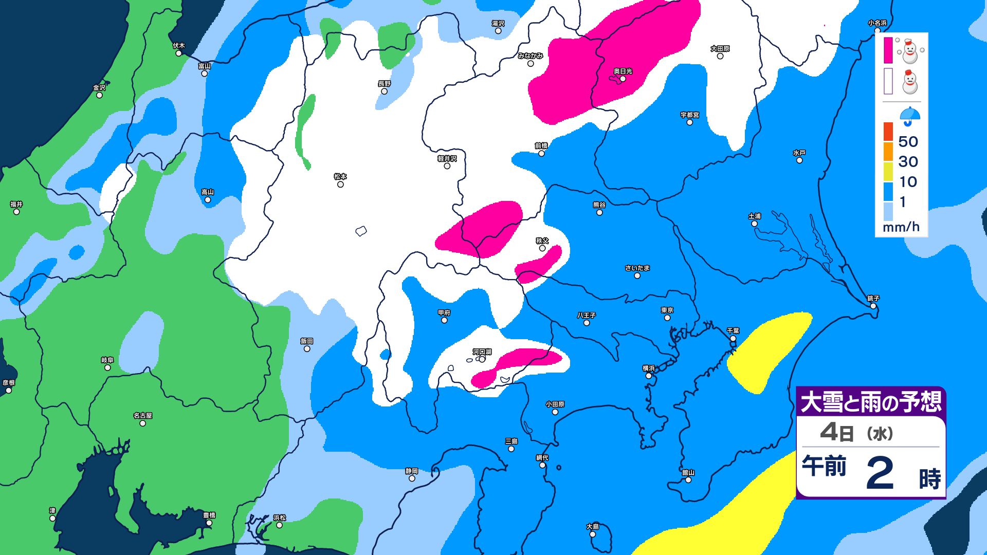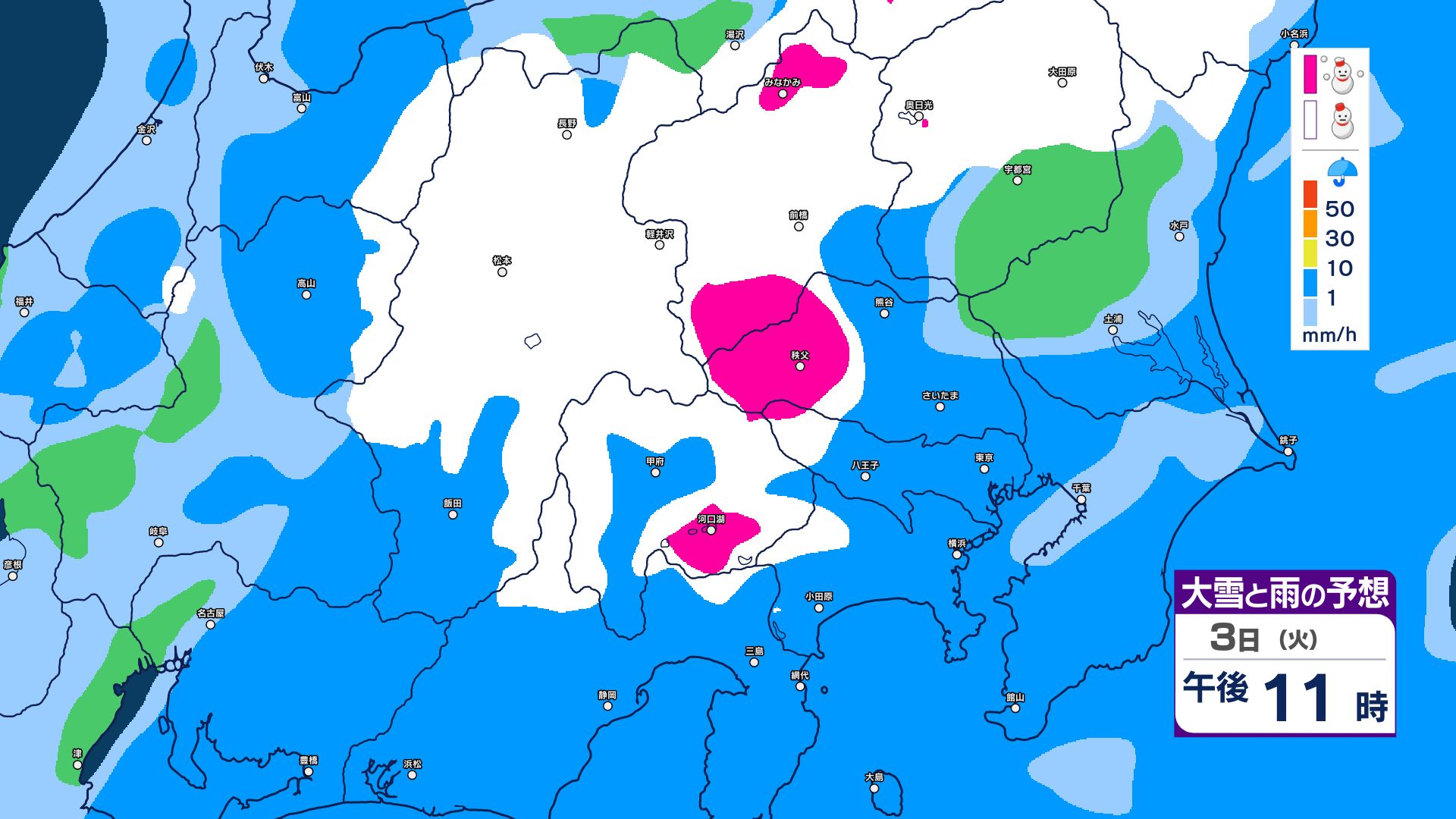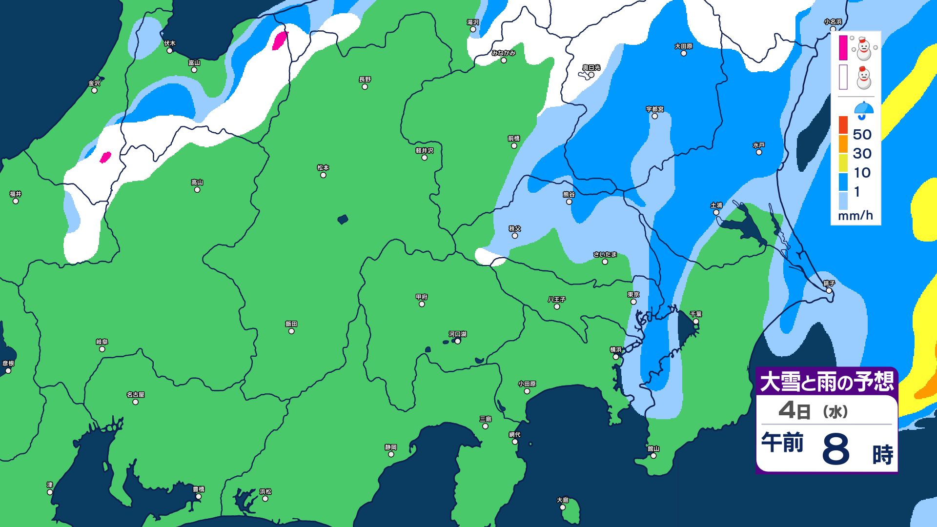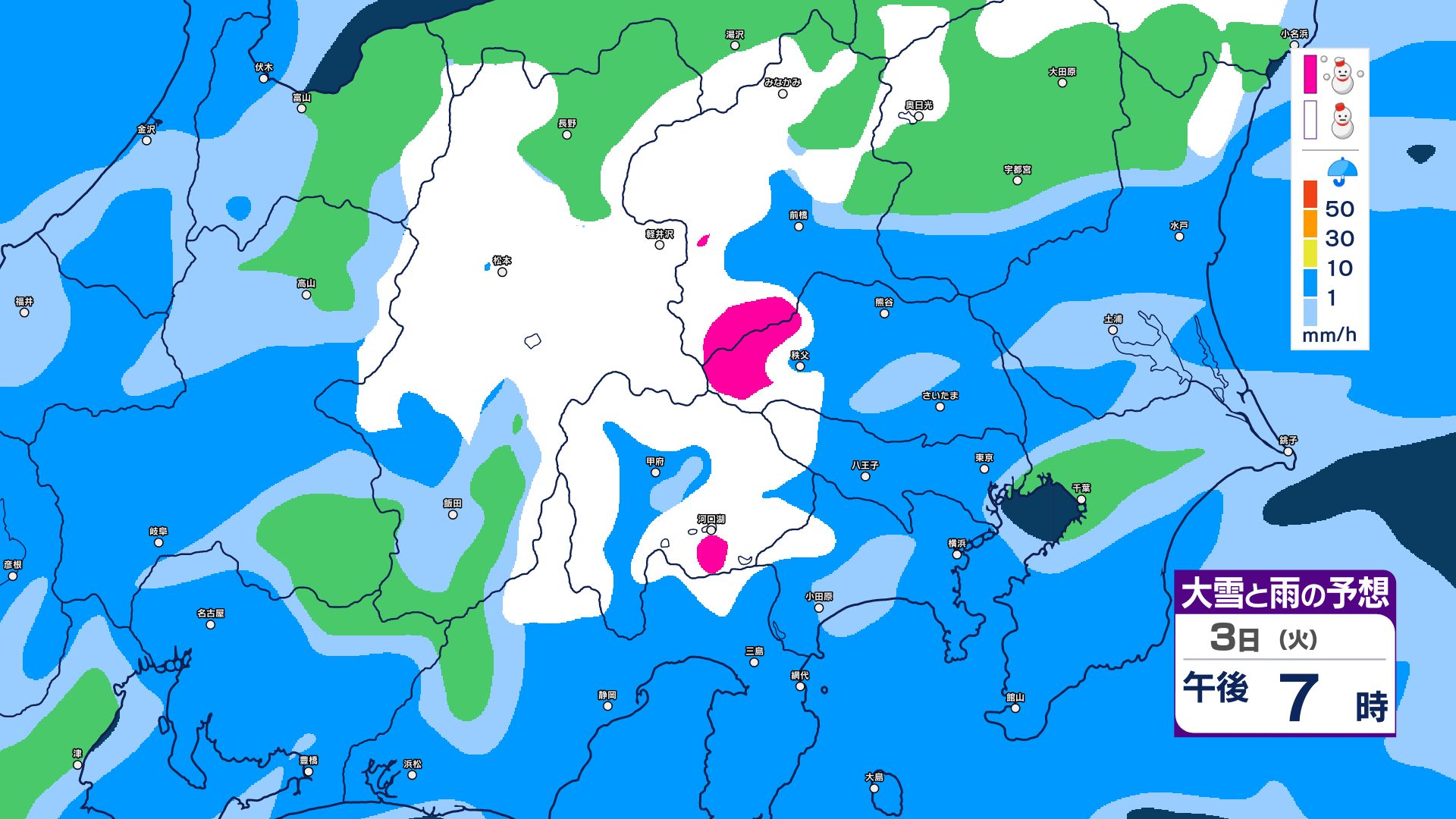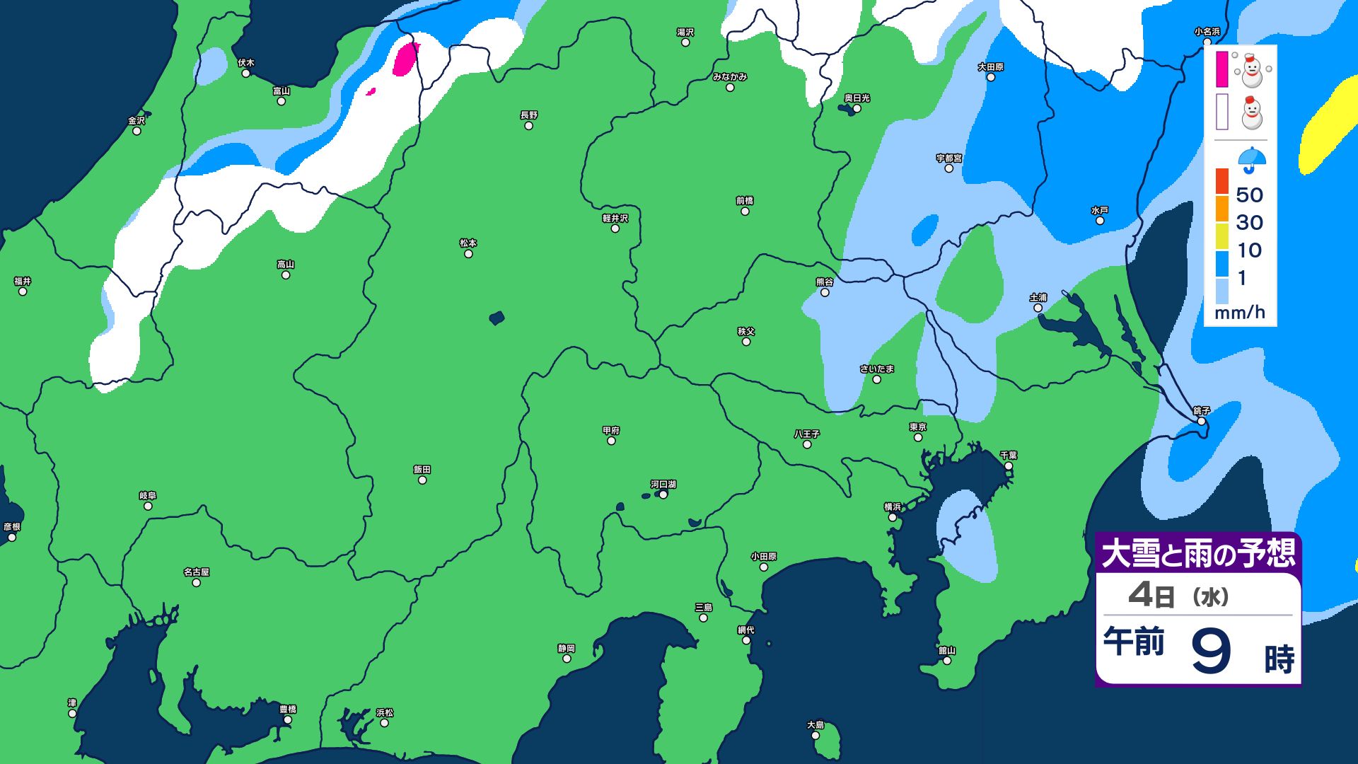 【大雪情報】長野県中部 4日明け方にかけ 大雪や路面の凍結による交通障害に十分注意【雪と雨のシミュレーション画像掲載】20センチ…大北山沿い・上田菅平・佐久・乗鞍上高地・諏訪(~4日午後6時・多い所)長野地方気象台 2026年3月3日(火) 16:31 国内 大雪と雨の予想(3日~5日)