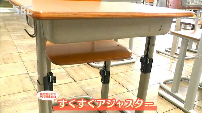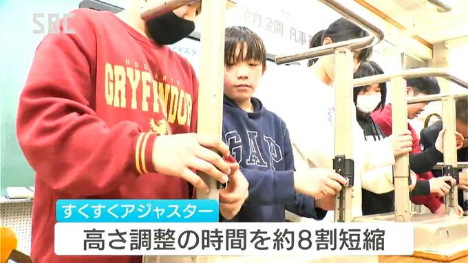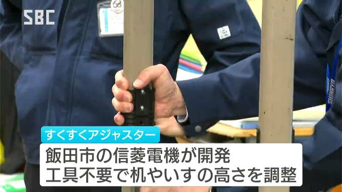 飯田市の山本小学校の教室で披露された新製品は、その名も「すくすくアジャスター」。