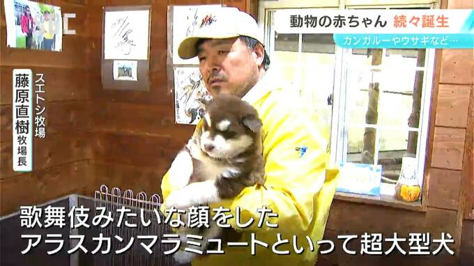 スエトシ牧場 藤原直樹牧場長:「歌舞伎みたいな顔をしたアラスカンマラミュートっていって超大型犬です。ほえないしものすごく優しいです。ぐいぐい引っ張ったりしないし、子どもでも散歩できます」