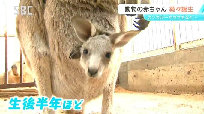 スエトシ牧場 藤原直樹牧場長:「ここにいるのはオオカンガルー。今ちょうど赤ちゃんが袋から顔を出していて、最初3センチくらいのネズミみたいに生まれて、その日にお母さんのお腹をはい上がって袋の中に入る。袋の中に乳首がある。ずっと袋の中で半年間育つ」