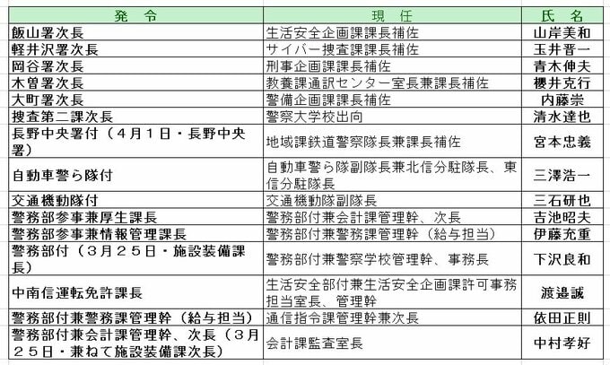 長野県警定期人事異動 第1次異動(次長級以上警察官・管理幹級以上警察行政職員)【名簿・写真掲載】14警察署長が交代 警察学校長に初の女性