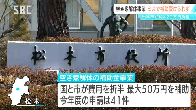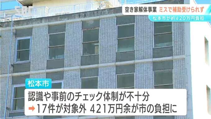 松本市が実施している古い空き家を解体する際の補助金事業で、確認ミスにより国の補助が受けられず、市がおよそ420万円を負担することになりました。