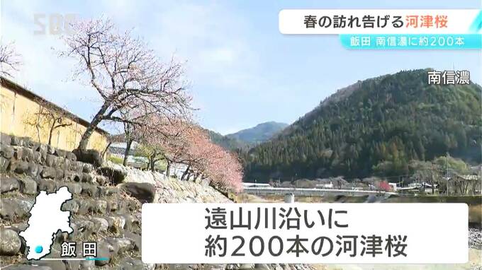 飯田市南信濃の遠山川沿いには、およそ200本の河津桜が植えられていて、可憐な花が咲き始めました。