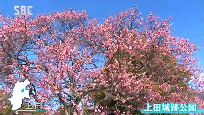 青空のもとで紅白の花が揺れる上田市の上田城跡公園。園内にはおよそ30本の梅の木が植えられています。