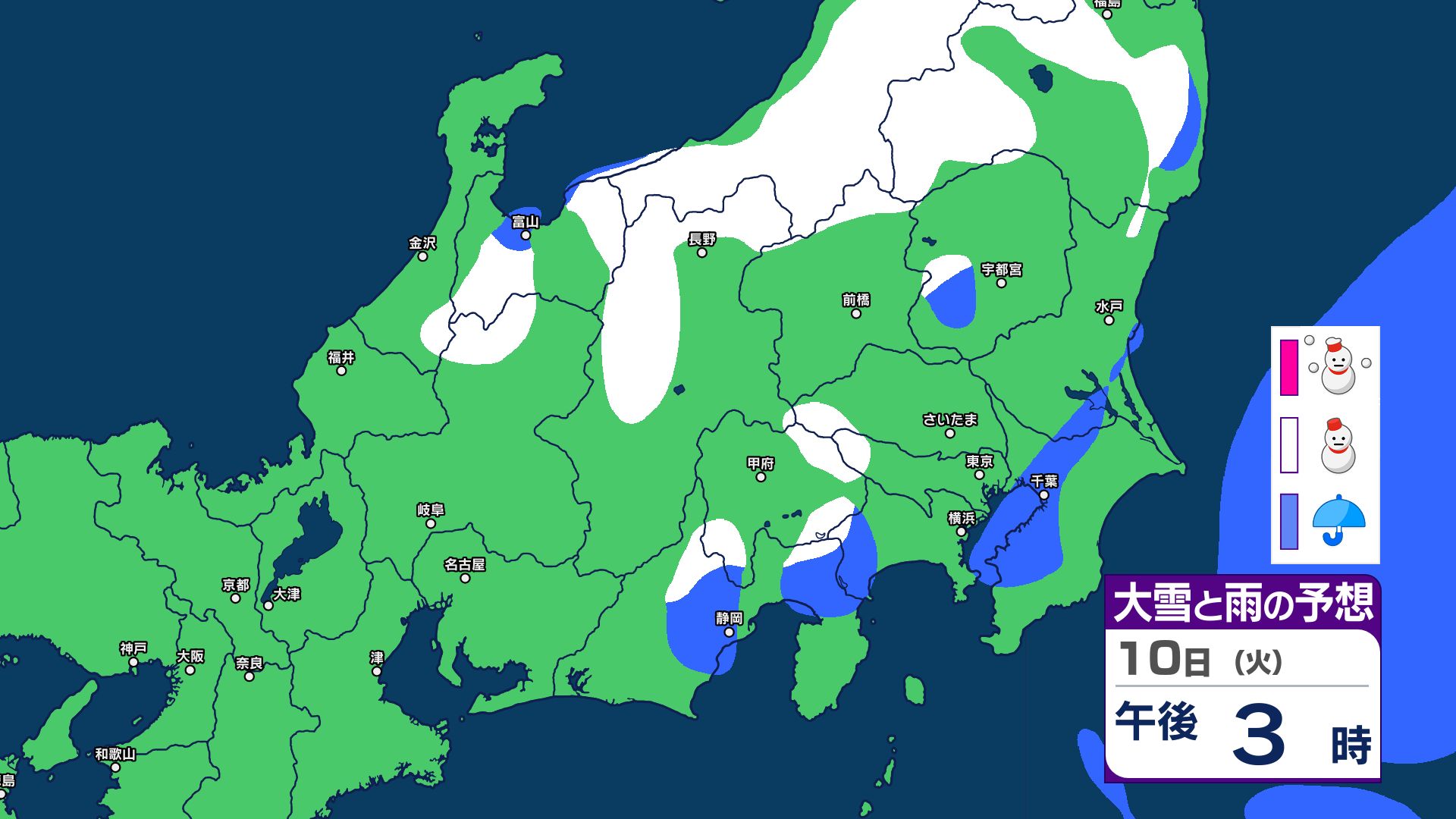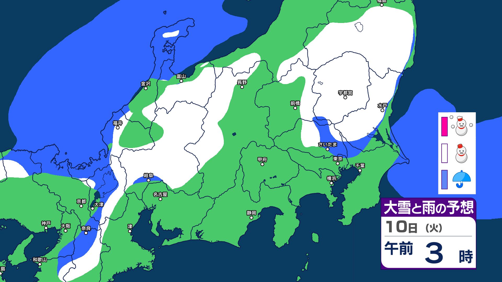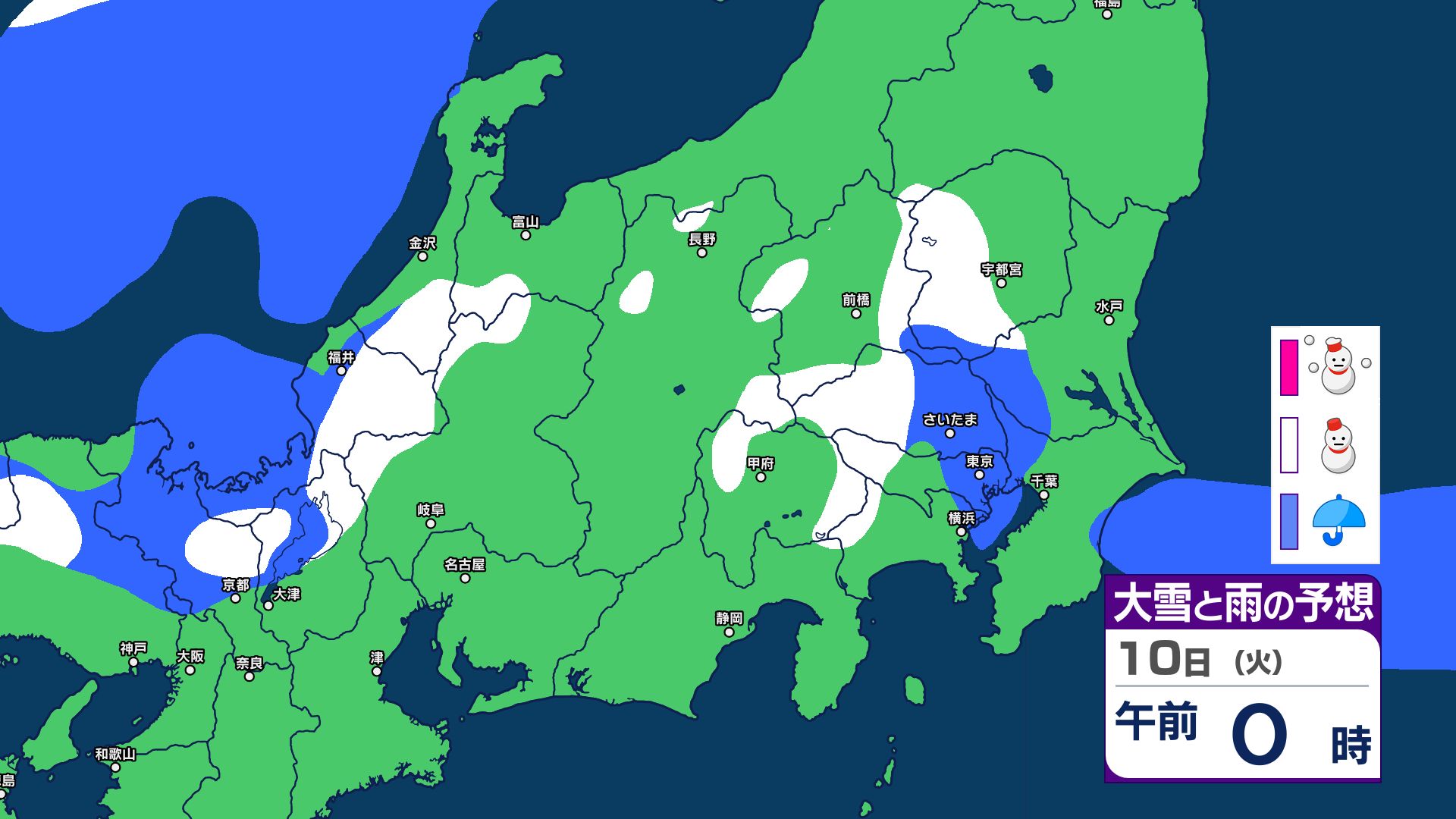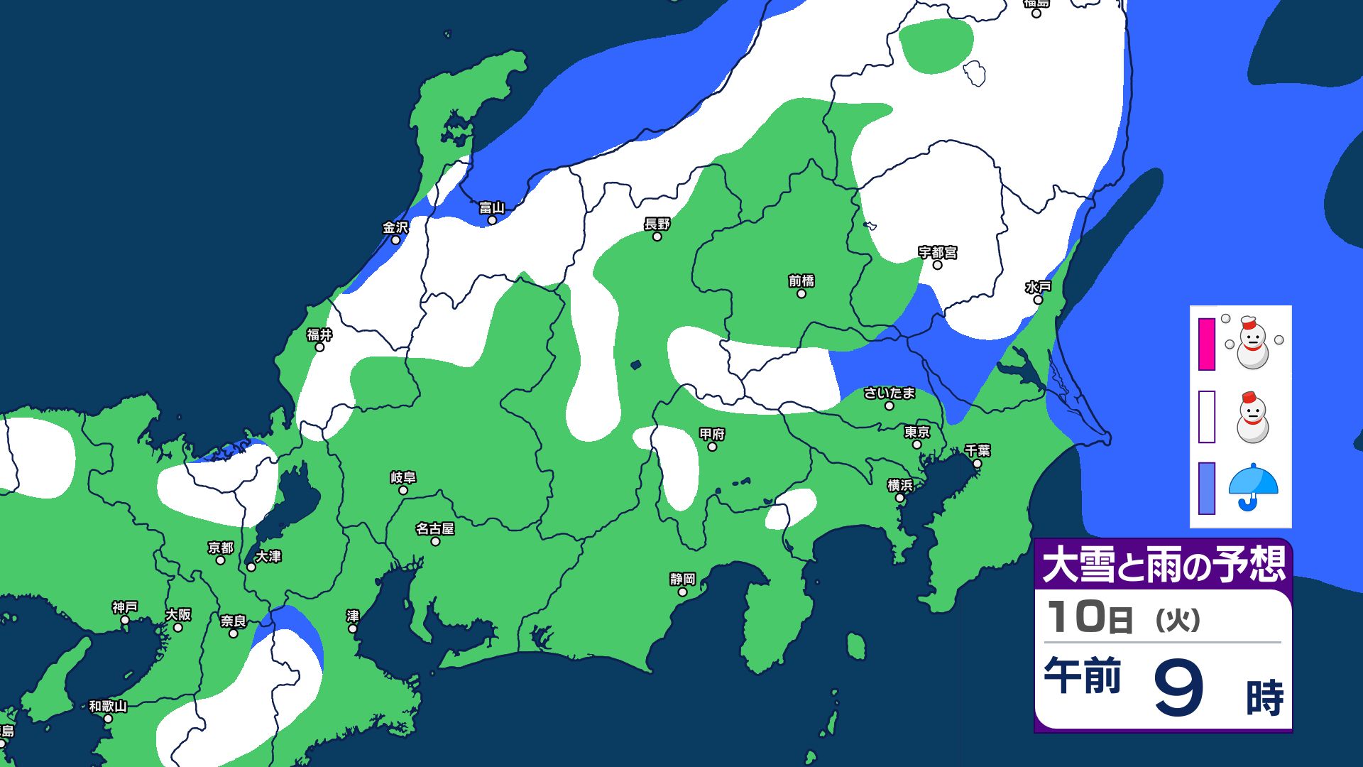 【大雪情報】関東甲信 10日未明~朝にかけ 関東北部の平地で7センチ予想 【雪と雨のシミュレーション画像掲載】気象庁 積雪や路面の凍結による交通障害に注意・警戒呼びかけ 2026年3月9日(月) 17:43 国内 3月9日~10日の雪と雨のシミュレーション