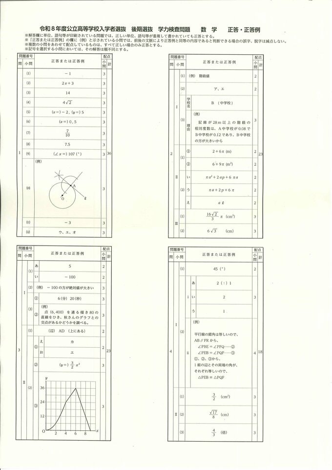 長野県高校入試2026【数学・問題と正答・正答例】後期選抜