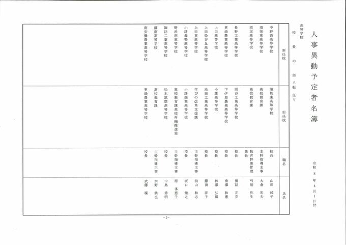 【県立高校長人事異動】異動総数は41人【名簿・顔写真掲載】 転任は13人 新任は12人 退任は16人 女性校長登用は2人 長野 2026年3月10日(火) 18:23 国内 校長 中野西 山田純子氏 須坂東 大倉宏夫氏 須坂 弓削弥生氏 長野工業 橋詰正克氏 更級農業 垂澤和憲氏 上田 栁澤弘蔵氏 上田染谷丘 藤田洋子氏 上田東 前山和志氏 小諸義塾 坂口健之氏 野沢南 原多恵子氏 諏訪二葉 中島秀明氏 蘇南 水野鉄也氏 南安曇農業 武藤穣氏