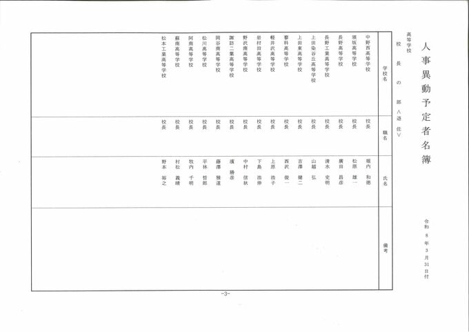 【県立高校長人事異動】異動総数は41人【名簿・顔写真掲載】 転任は13人 新任は12人 退任は16人 女性校長登用は2人 長野