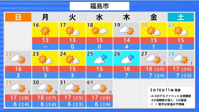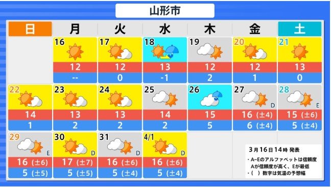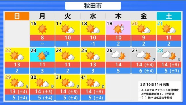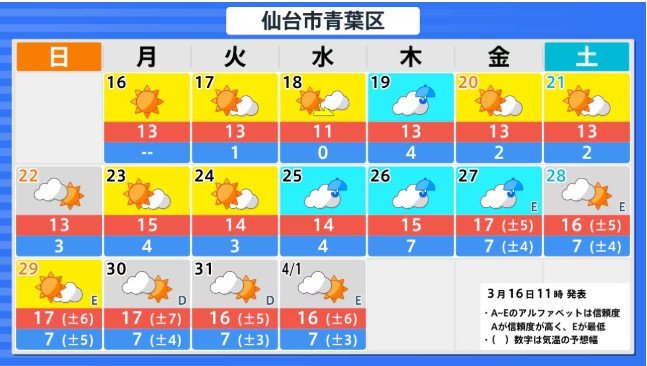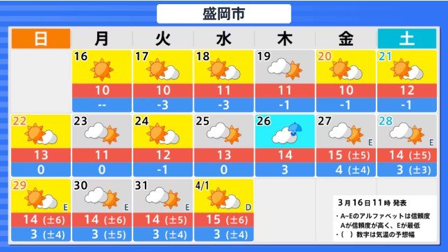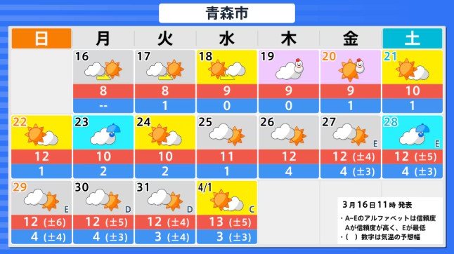 東北地方の向こう2週間の気温は、暖かい空気が流れ込みやすいため高く、23日頃からはかなり高くなる可能性があります。農作物の管理等に注意してください。積雪の多い地域ではなだれに注意してください。