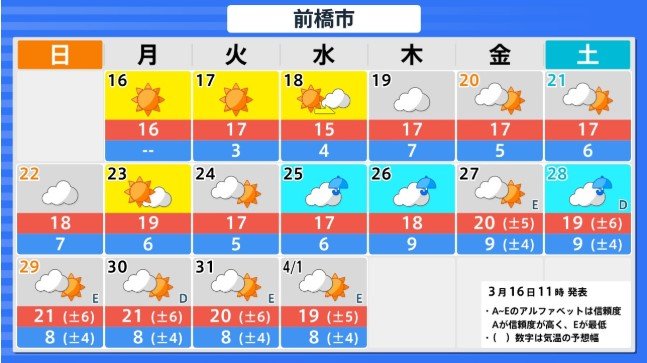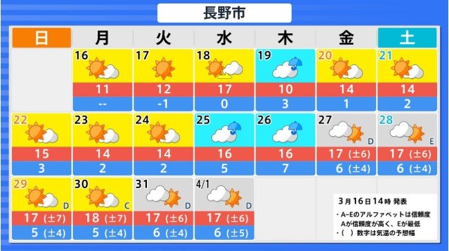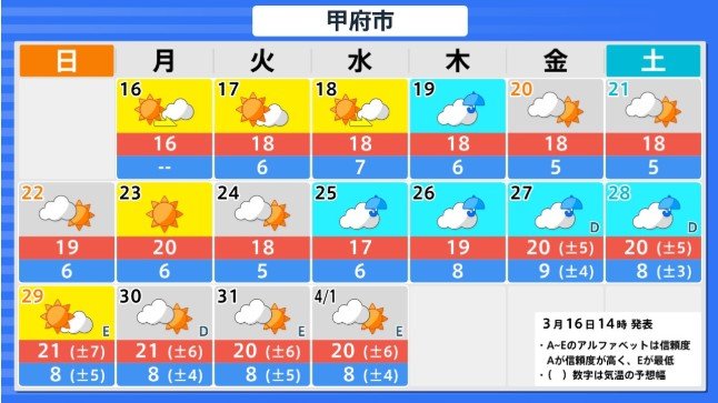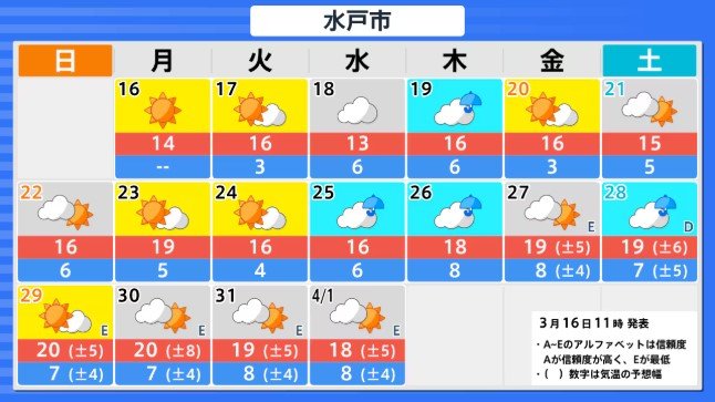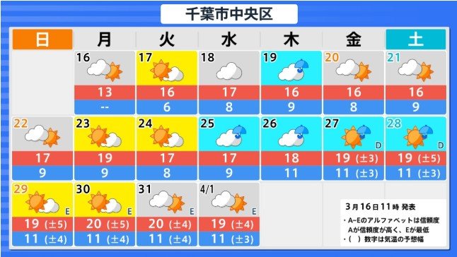 「かなりの高温」沖縄地方を除く各地が“真っ赤”に 3月22日頃~北海道 3月23日頃~東北 3月24日頃~関東甲信から九州南部にかけ【早期天候情報】気象庁 北海道・東北・関東甲信・北陸・東海・近畿・中国・四国・九州【全国主要地点の16日間気温】 2026年3月16日(月) 16:04 国内 高温に関する早期天候情報(関東甲信地方) 3月16日午後2時30分 気象庁 発表 関東甲信地方 3月24日頃から かなりの高温 かなりの高温の基準:5日間平均気温平年差+2.9℃以上 関東甲信地方の向こう2週間の気温は、暖かい空気が流れ込みやすいため高く、24日頃からはかなり高くなる可能性があります。農作物の管理等に注意してください。積雪の多い地域ではなだれに注意してください。また、今後の気象情報等に留意してください。