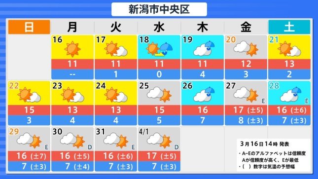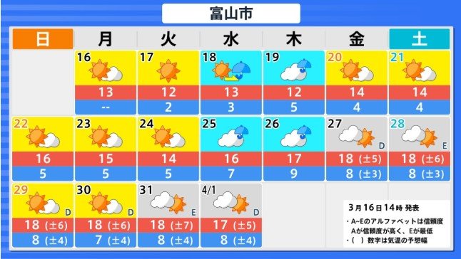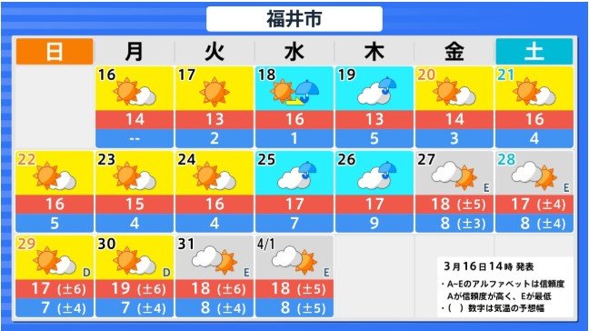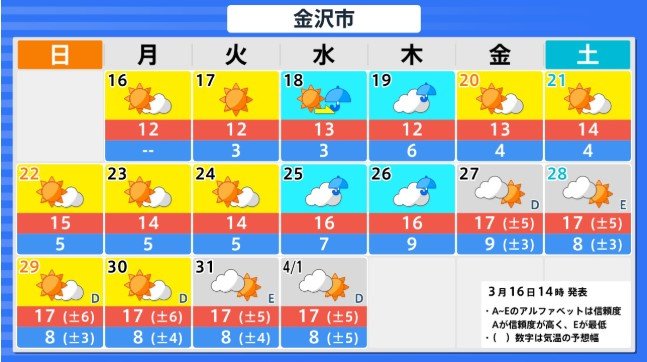 北陸地方の気温は、向こう5日間程度は平年並ですが、その後は暖かい空気が流れ込みやすくなるため高く、24日頃からはかなり高くなる可能性があります。農作物の管理等に注意してください。積雪の多い地域ではなだれに注意してください。